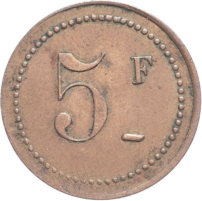 - ALGERIA IIIe République (1870-1940). Monnaie de nécessité, Fuentes & Macia à El-Fahoul, 5 francs ND.