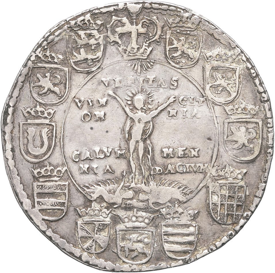Rv. VERITAS / VIN - CIT / OM - NIA / CALVM - MEN / NIA - DACIVM. La Vérité debout de face, rayonnante. Bordure de onze écus et à 12 h le cheval de Brubnswick entre deux accolades.