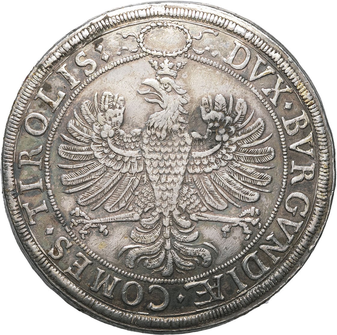Rv. DVX. BVRGVNDIÆ. COMES. TIROLIS:. Aigle couronnée et éployée de face, sous une couronne.