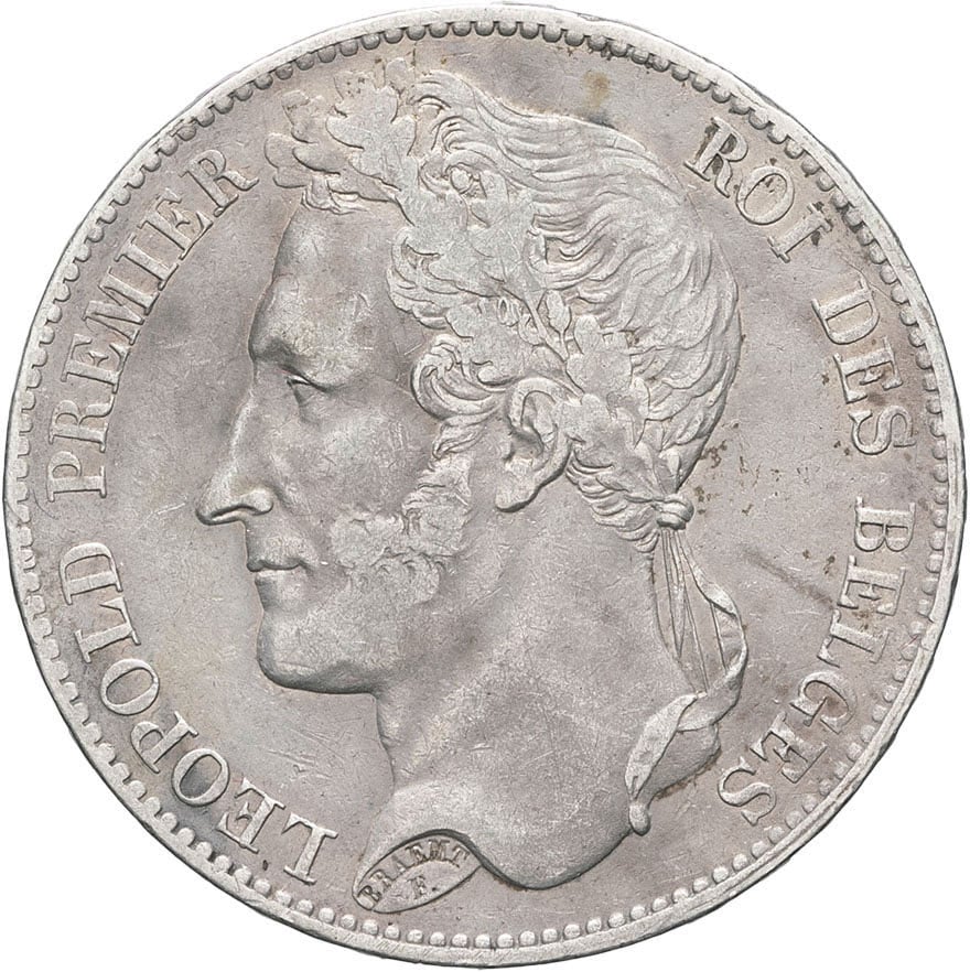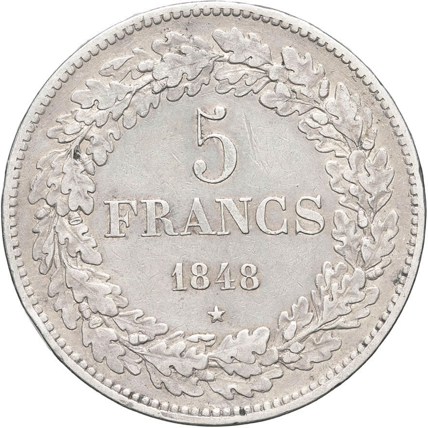 - BELGIUM Léopold Ier (1831-1865). 5 francs, tête laurée, tranche en relief 1848, Bruxelles.