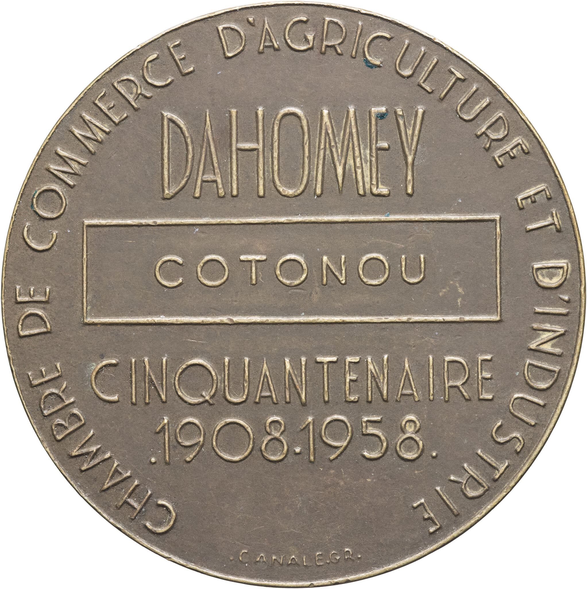 - République du Dahomey (1960-1975). Médaille, 50e anniversaire de la Chambre de commerce, d’agriculture et d’industrie du Dahomey, Première pierre du port de Cotonou, par Canale 1959, Paris (Canale).