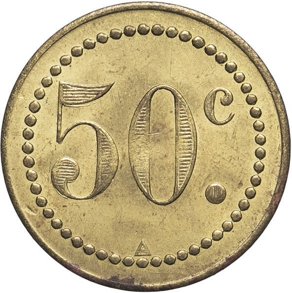 - CAMEROON Sous mandat français (1919-1947). Monnaie de nécessité, Société nationale du Cameroun, 50 centimes ND.