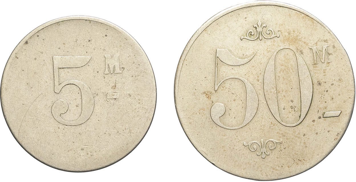 - EGYPT IIIe République (1870-1940). Lot de 2 monnaies de nécessité, Splendid-bar à Minieh, 5 et 50 millièmes ND.