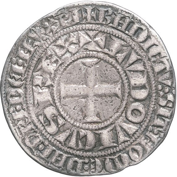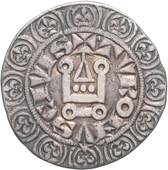 Rv. +· TVRONVS CIVIS. Châtel tournois. Bordure de douze lis dans des oves ; une étoile au bas du grènetis intérieur.