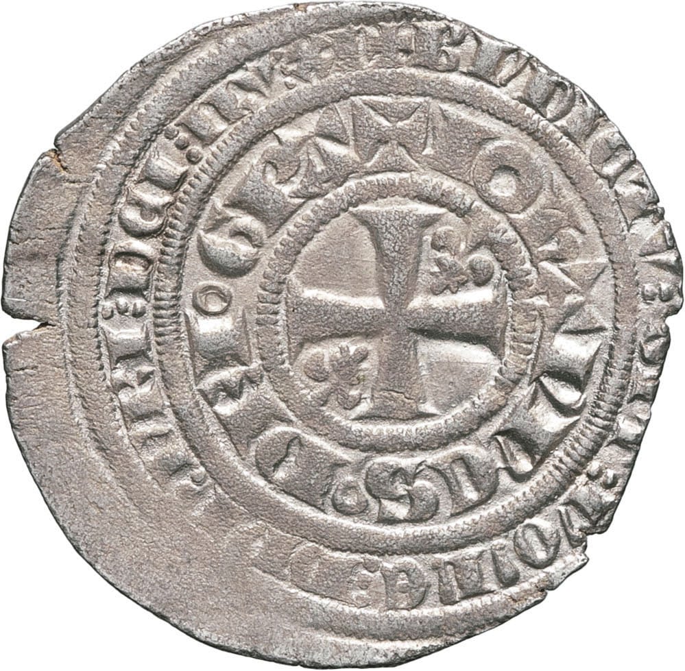 Av. + IOHANNES° DEI° GRA. Croix cantonnée d’un lis au 2 et au 3 ; légende extérieure.