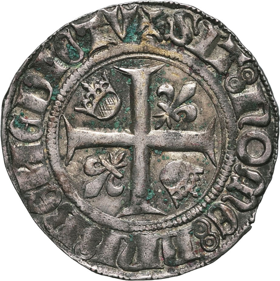 Avec un annelet creux sous la croisette initiale : pour Paris. Quelques points de vert de gris. Superbe.