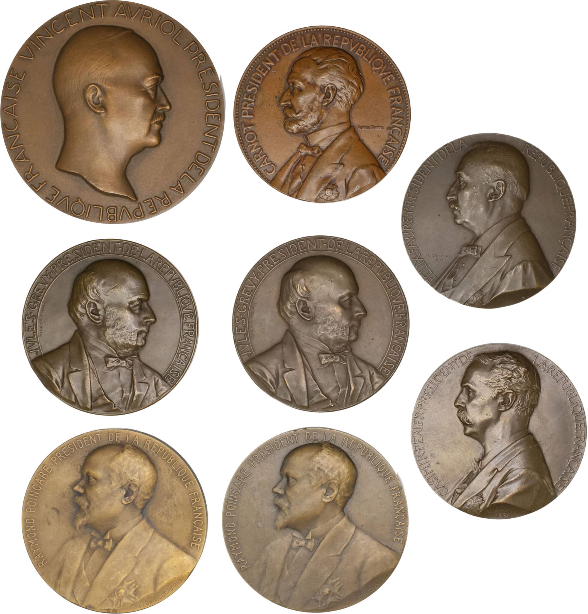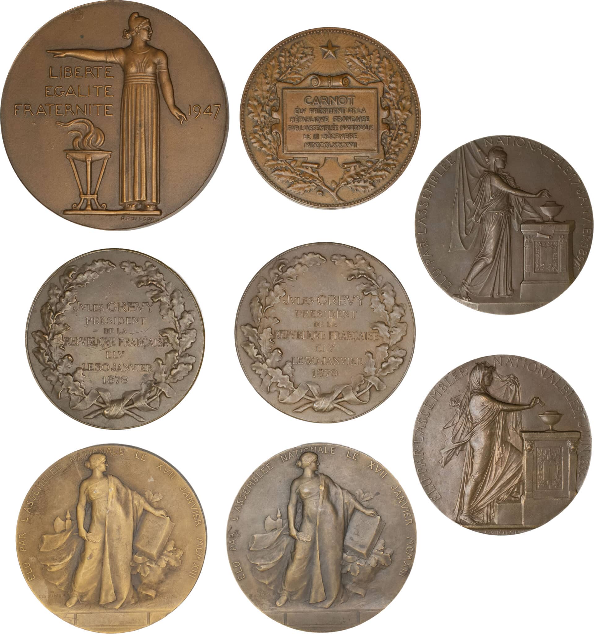 Jules Grévy 1879 par Daniel-Dupuis (2) - Sadi Carnot 1887 par Alphée Dubois - Casimir Périer 1894 par J.C. Chaplain - Félix Faure 1898 par J.C. Chaplain - Raymond Poincaré 1913 par Léon Deschamps (2) - Vincent Auriol 1947 par P. Poisson