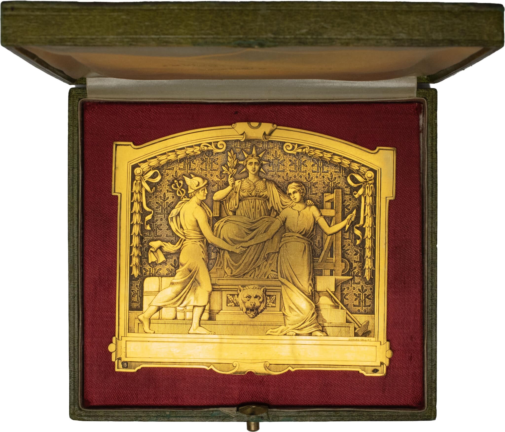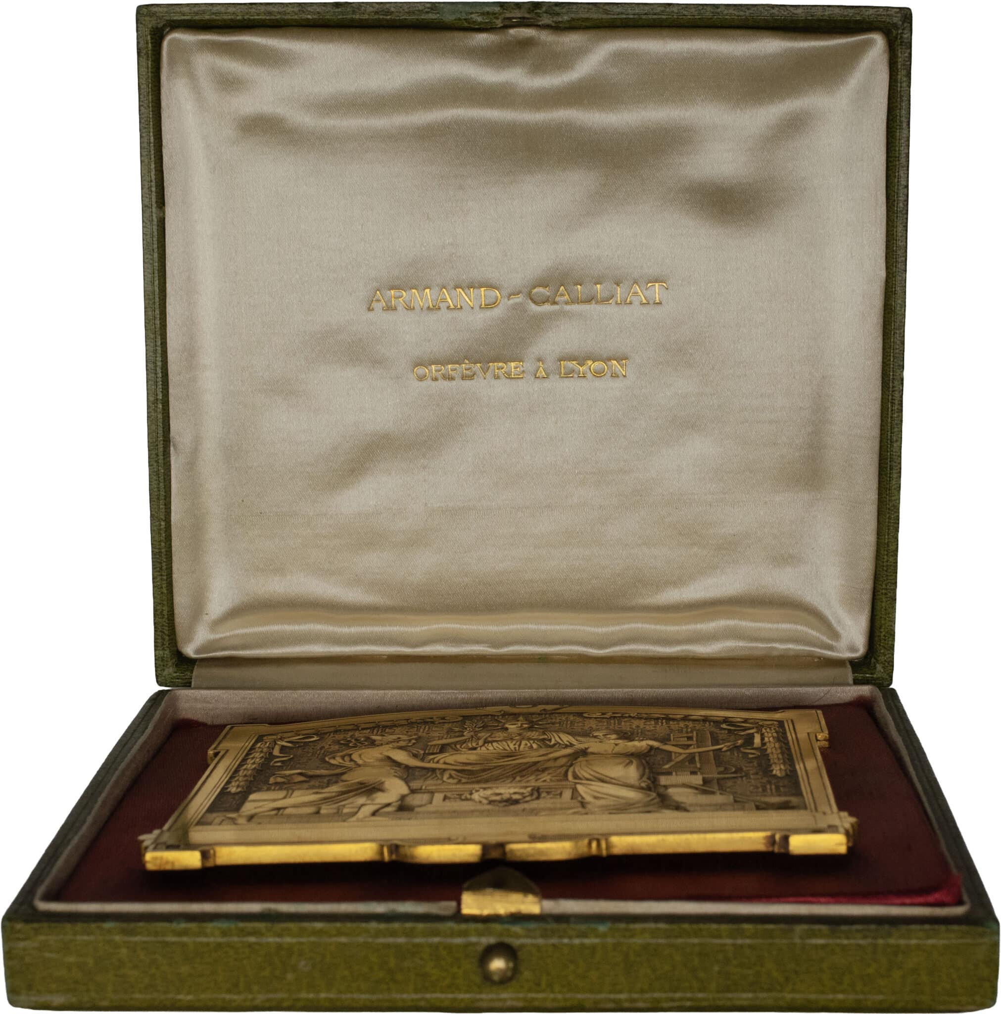 Spectaculaire plaque en vermeil (argent doré) avec poinçons tête de Minerve et losange, par Thomas Joseph Armand-Calliat, orfèvre lyonnais (1822-1901) et gravée en taille douce. Dans son coffret d'origine