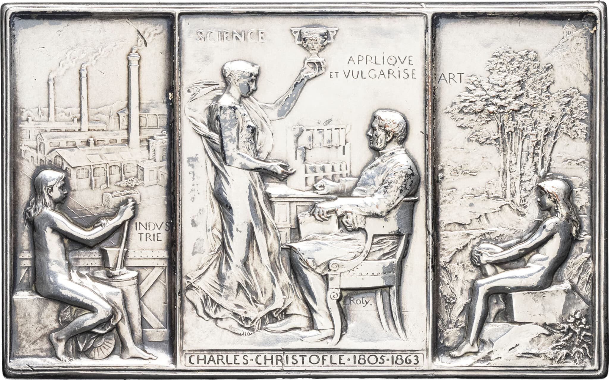 Av. CHARLES. CHRISTOFLE. 1806. 1863. Charles Christofle assis devant la science, au-dessus SCIENCE/ APPLIQVE ET VULGARISE, signature ROTY, autour l'Industrie et l'Art.