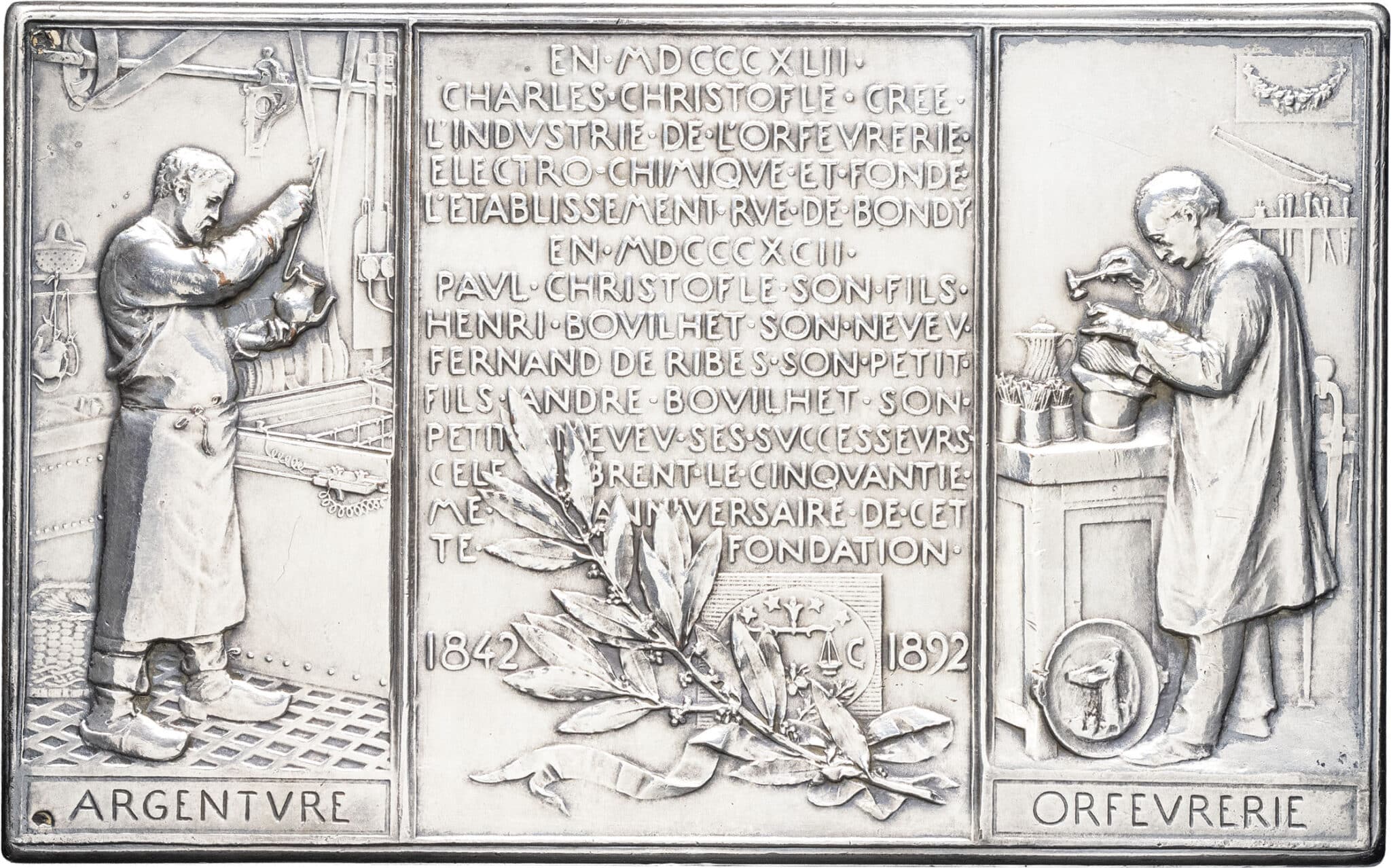 Rv. ARGENTVRE - ORFEVRERIE. Au-dessus d'une branche de laurier, inscription : EN MDCCCXLII/ CHARLES CHRISTOFLE CRÉE/ L'INDVSTRIE DE L'ORFEVRERIE etc. CINQVANTIE/ ME ANNIVERSAIRE DE CET/ TE FONDATION/ 1842 -1892 ; autour un ouvrier argenteur, Paulin Tasset, et Oscar Roty au travail d'orfèvrerie lors de son passage chez Christofle.
