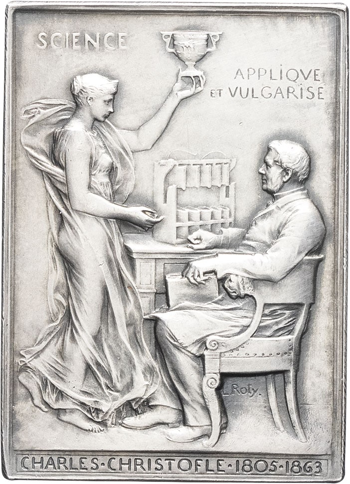Av. CHARLES. CHRISTOFLE. 1806. 1863. Charles Christofle assis devant la science, au-dessus SCIENCE/ APPLIQVE ET VULGARISE, signature ROTY, autour l'Industrie et l'Art.
