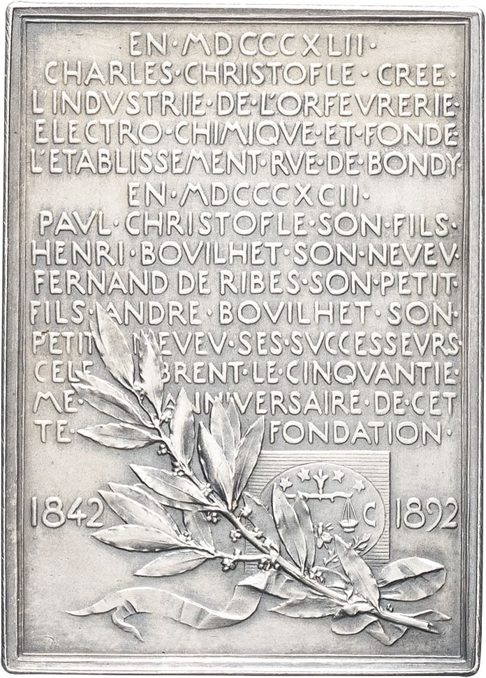 - MÉDAILLES - Économie et Industrie. Plaquette, cinquantenaire de la fondation de la maison Christofle, par O. Roty 1893, Paris.