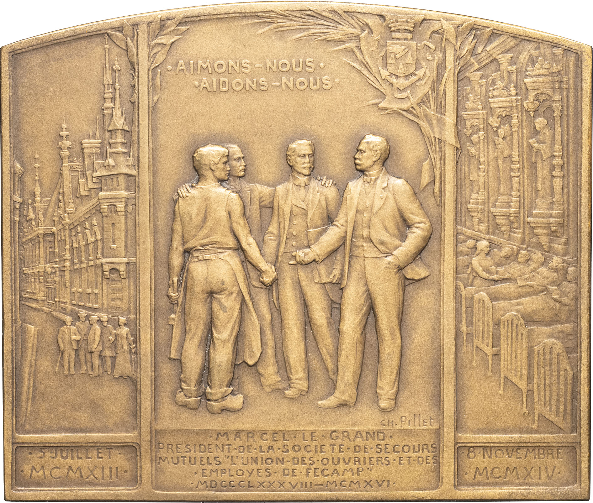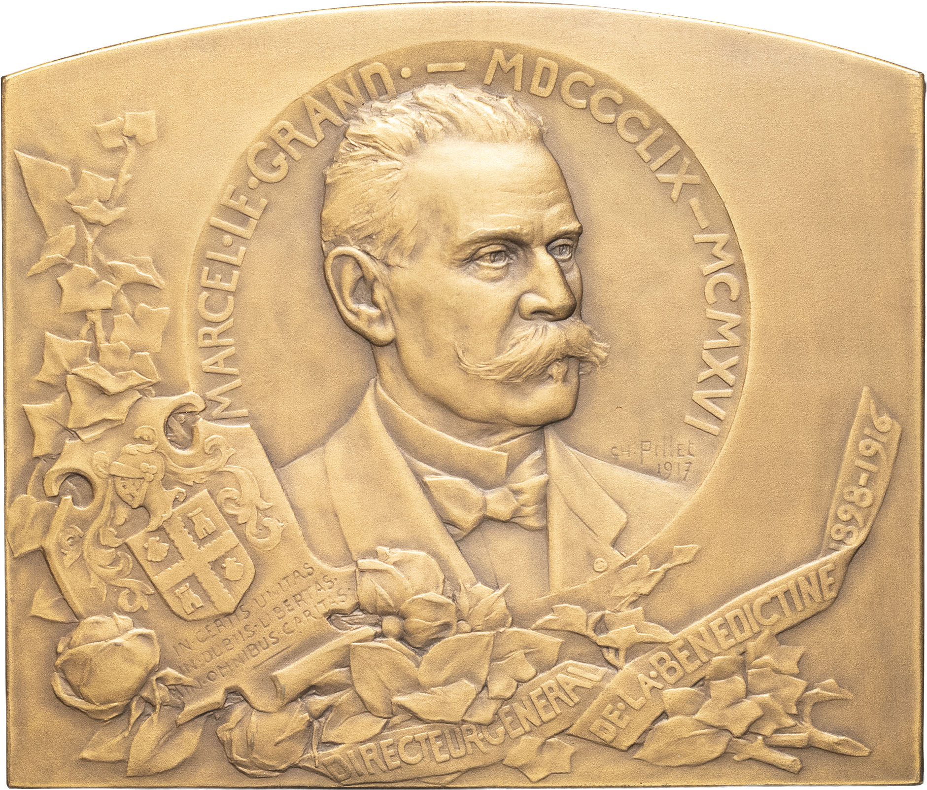 - MÉDAILLES - Économie et Industrie. Plaque, hommage à Marcel Le Grand, directeur général de La Bénédictine et président de la Société de secours mutuels “l’Union des ouvriers et des employés de Fécamp”, par Ch. Pillet 1917, Paris.