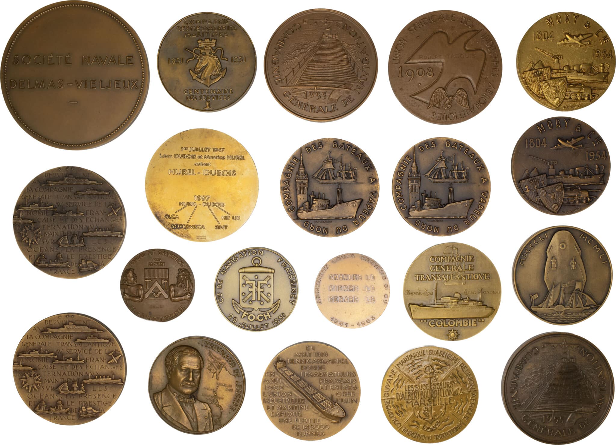 - MÉDAILLES - Économie et Industrie. Lot de 20 médailles relatives à la construction navale et aux transports.