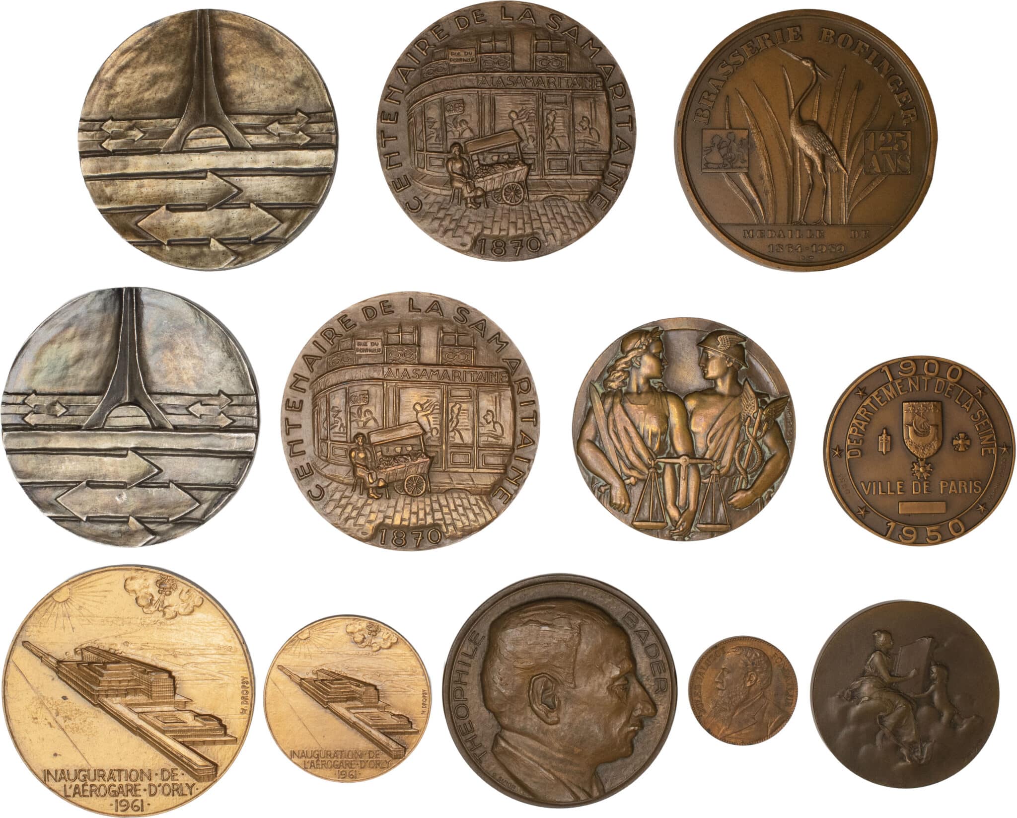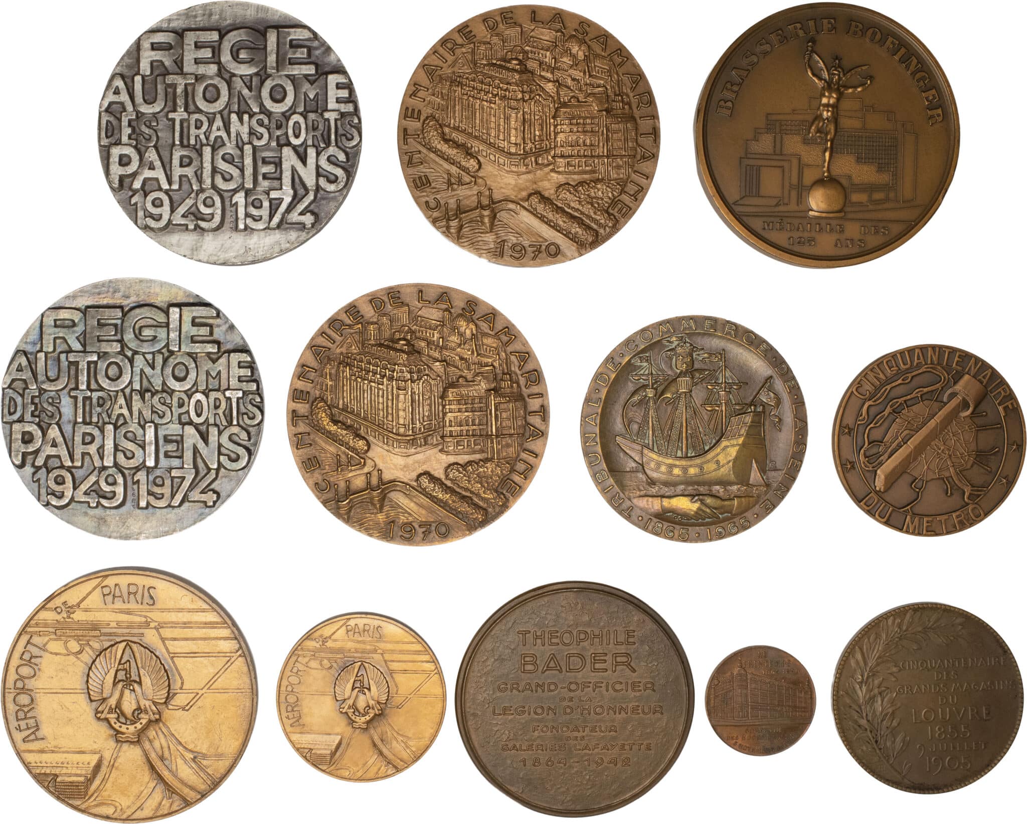 Théophile Bader fondateur des Galeries Lafayette par Simon - centenaire de la Samaritaine 1970 par Torcheux (2) - cinquantenaire des Grands magasins du Louvre 1905 par Daniel-Dupuis - cinquantenaire du métro 1950 par Costa - noces d’argent de Au Printemps 1890 par Tasset - inauguration de l’aérogare d’orly 1961 par Dropsy (2, petit et grand module) - 25 ans de la Régie autonome des transports parisiens 1974 par Lery (2) - 125 ans de la Brasserie Boffinger 1989 - centenaire du Tribunal de commerce de la Seine 1965 par Cochet