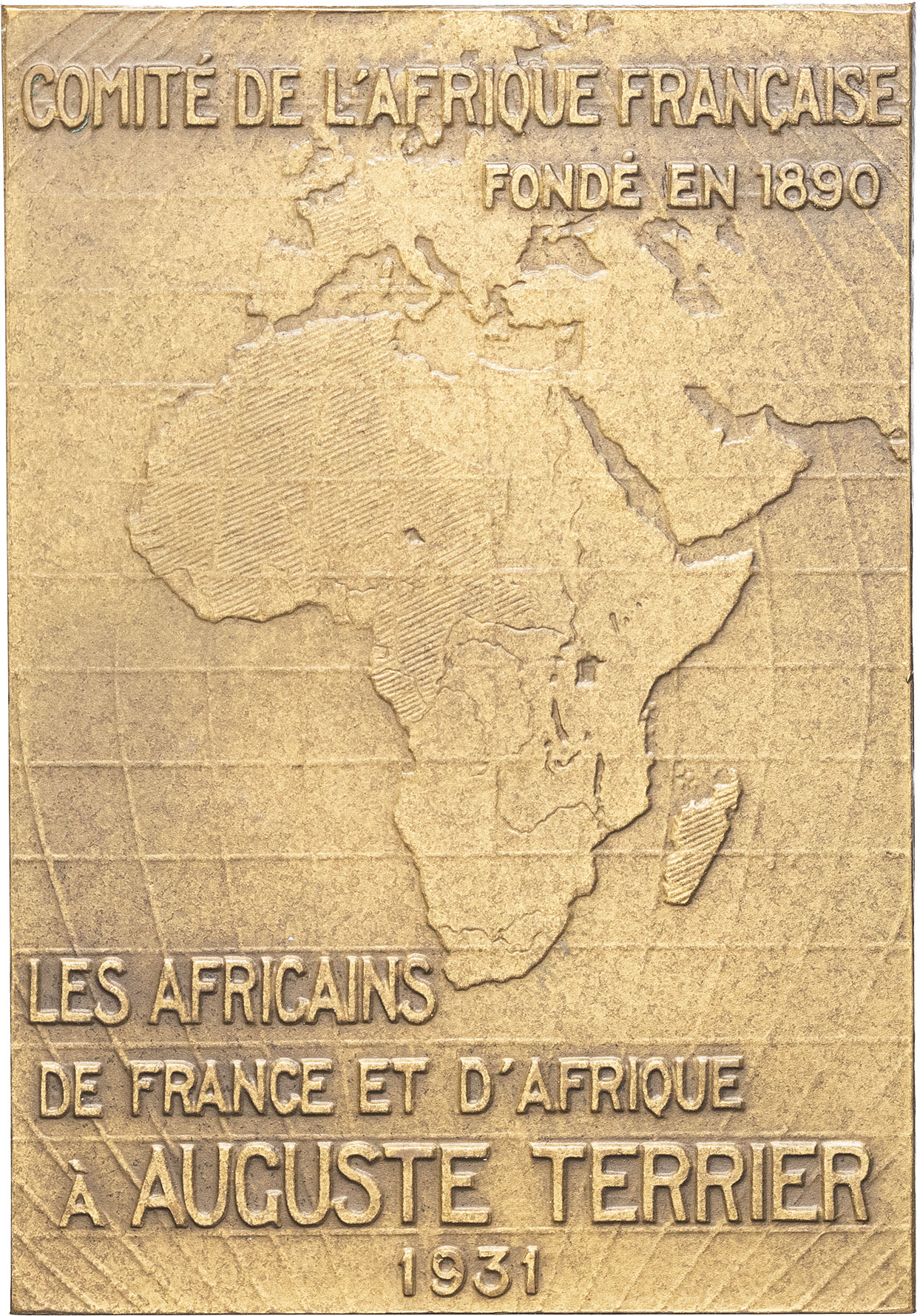 - MÉDAILLES - Expositions et foires. Plaquette, hommage à Auguste Terrier, secrétaire général du Comité de l’Afrique française, par De Hérain 1931, Paris (Arthus-Bertrand).