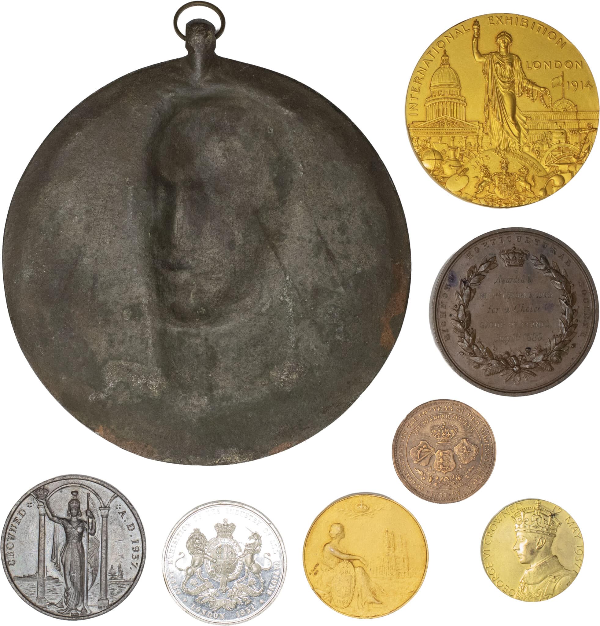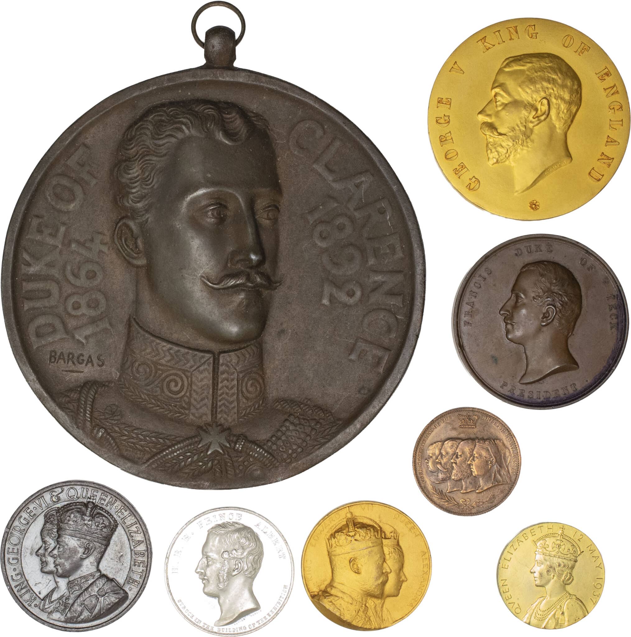Le prince Albert et l’exposition internationale de 1851 par W.J. Taylor - Francis duc de Teck et la société d’horticulture de Richmond 1880 par Adams - la famille royale et le jubilé de diamant 1897 par Grueber - le duc de Clarence par Bargas - Couronnement d’Edouard VII et Alexandra 1902 par Fuchs - Exposition internationale de Londres 1914 par Wyon - Couronnement de Georges VI et Marie 1937 par P. Metcafle - Couronnement de Georges VI et Marie 1937 par Britis