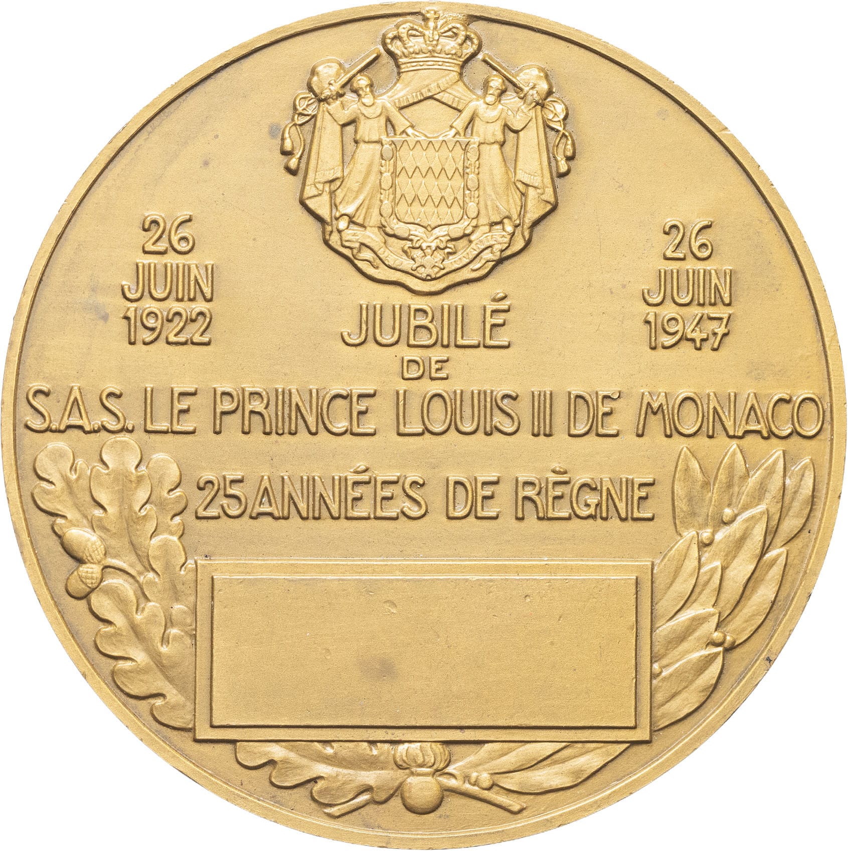 - MÉDAILLES - Souverains européens. . Médaille, 25 ans de règne de Louis II, par P. Turin 1947, Paris.