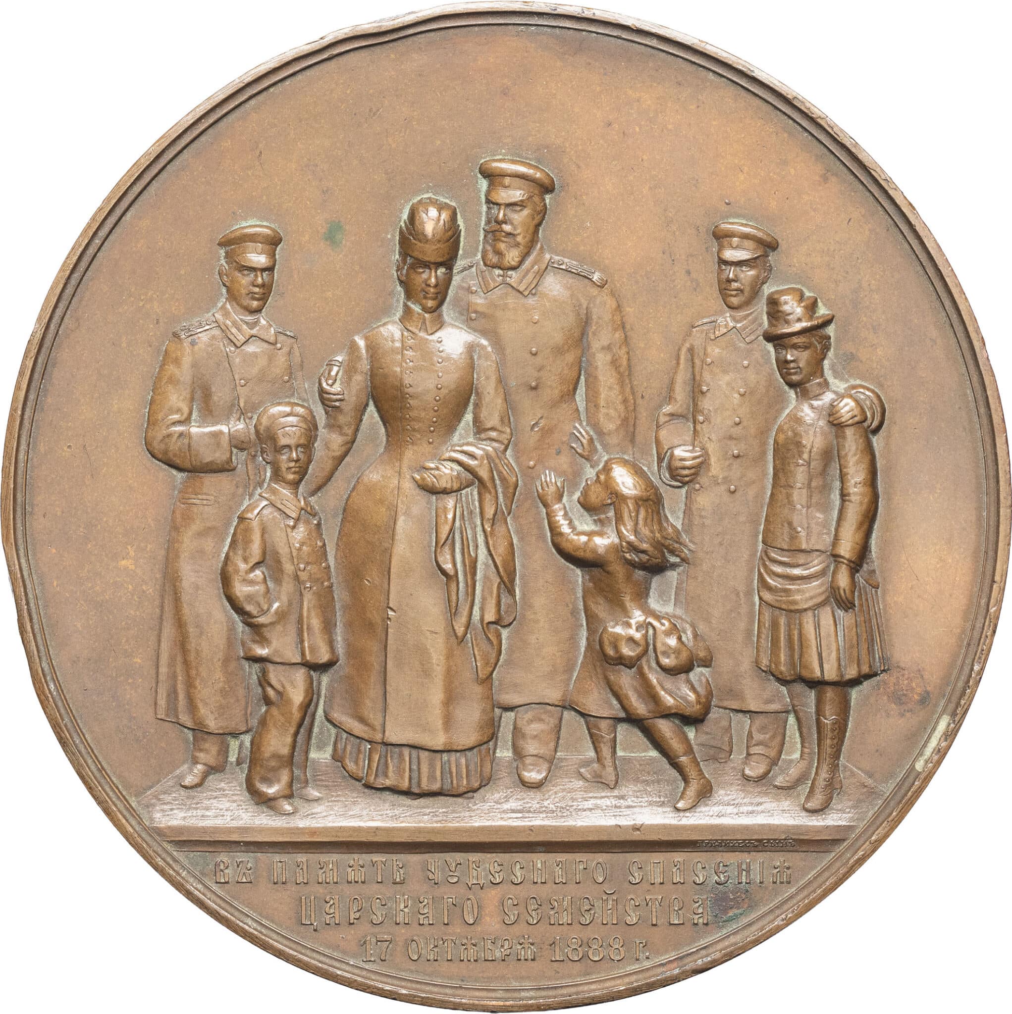 Av. Le tsar Alexandre III entouré des membres de sa famille. À l’exergue, légende en cyrillique et signature sur la ligne de sol ГРИЛИХЕСЪ СЬІНЪ.