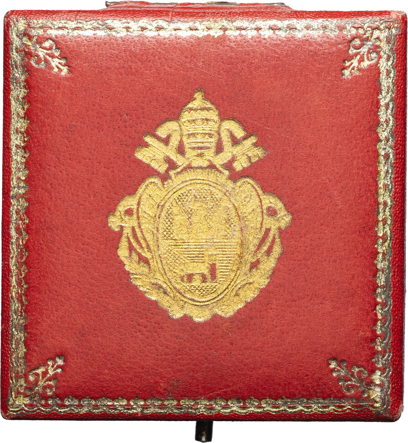 Dans l’écrin d’origine en similicuir et velours, le couvercle doré aux armes pontificales. Quelques marques dans les champs et sur le listel. Superbe.