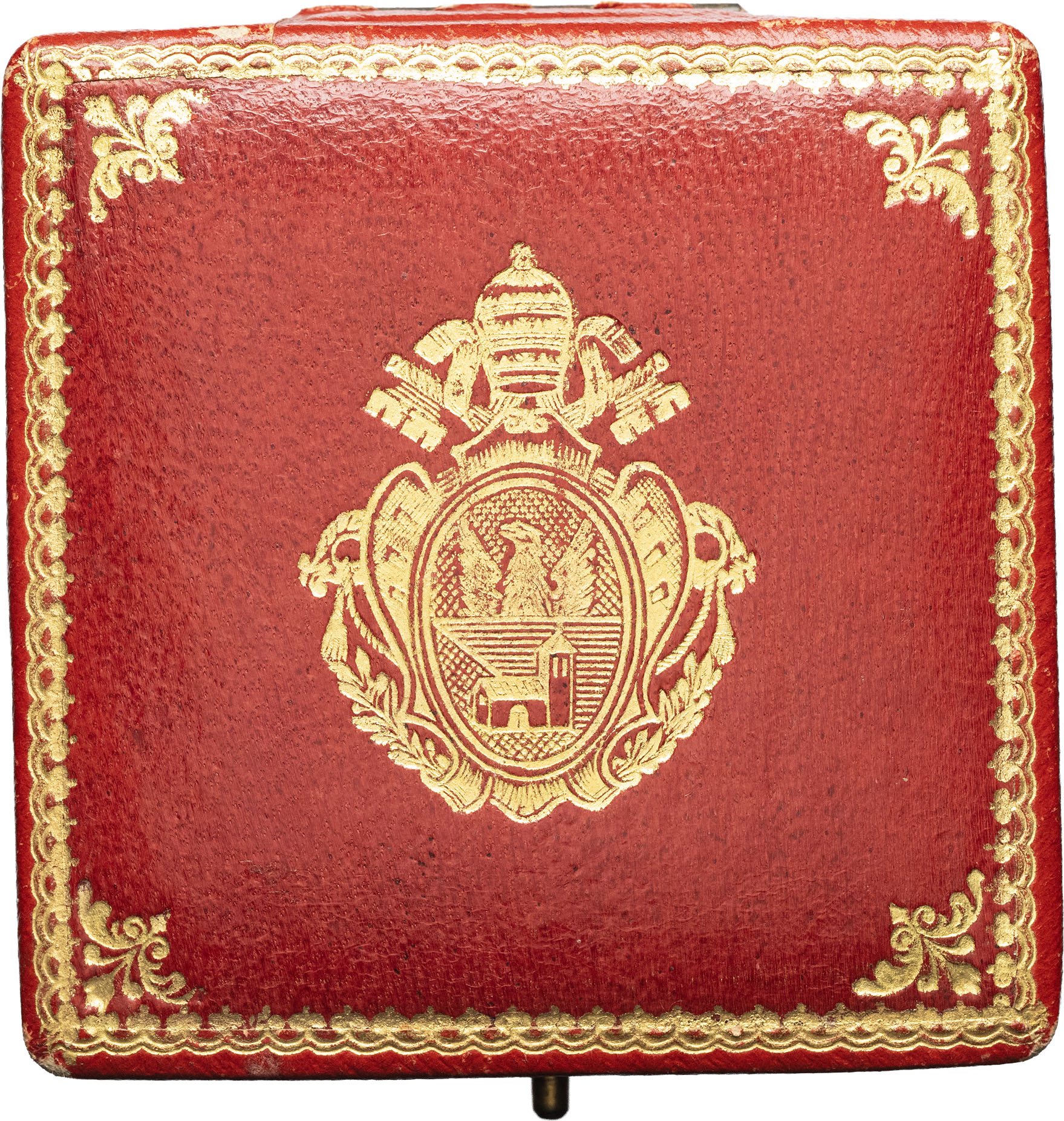 Dans l’écrin d’origine en similicuir et velours, le couvercle doré aux armes pontificales. Superbe.