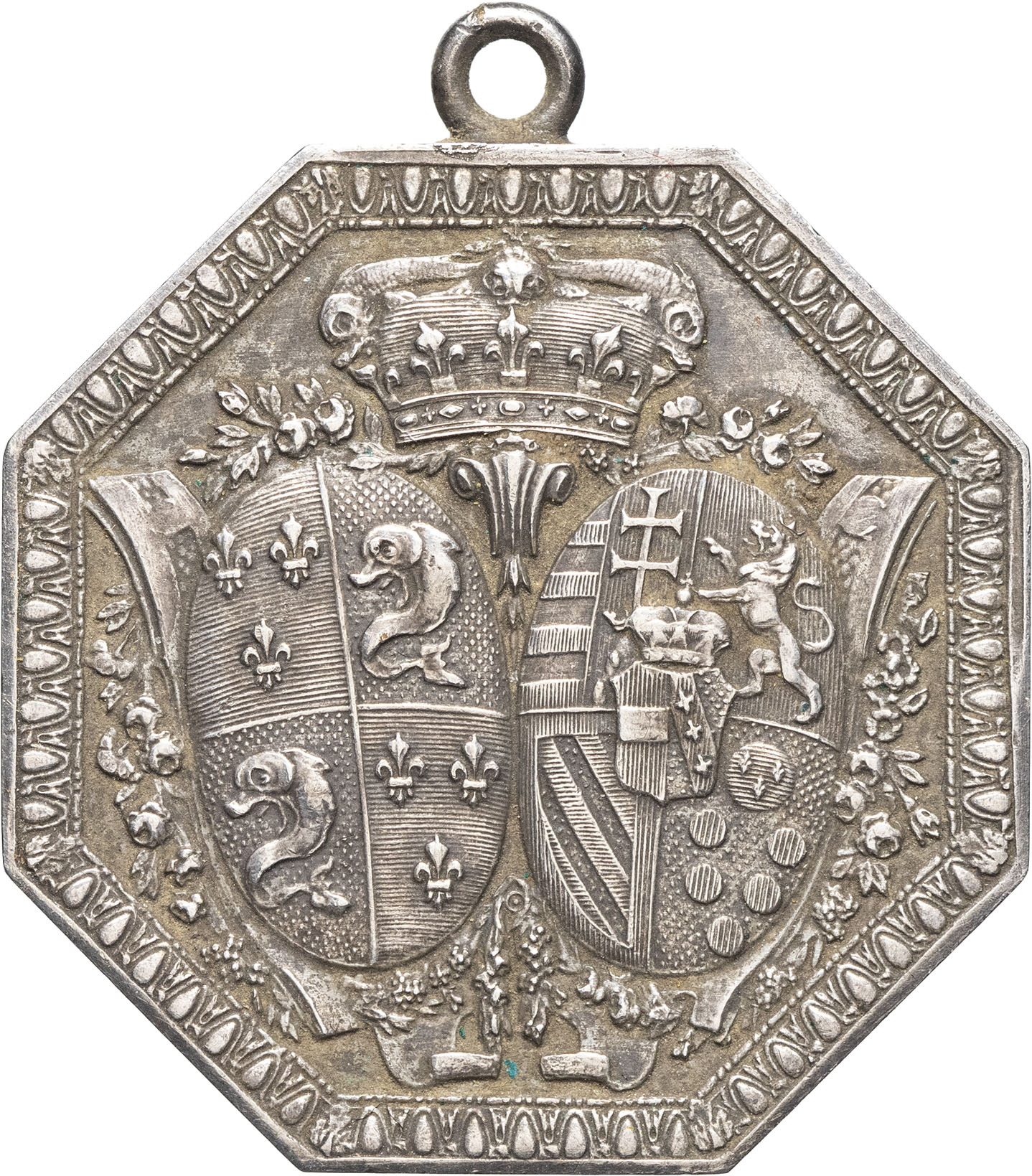 Avec les armes jointes de Louis Auguste dauphin et Marie-Antoinette dauphine de France à l’avers. Poinçon (corne) BR sur la tranche. Hairlines au revers. Superbe.