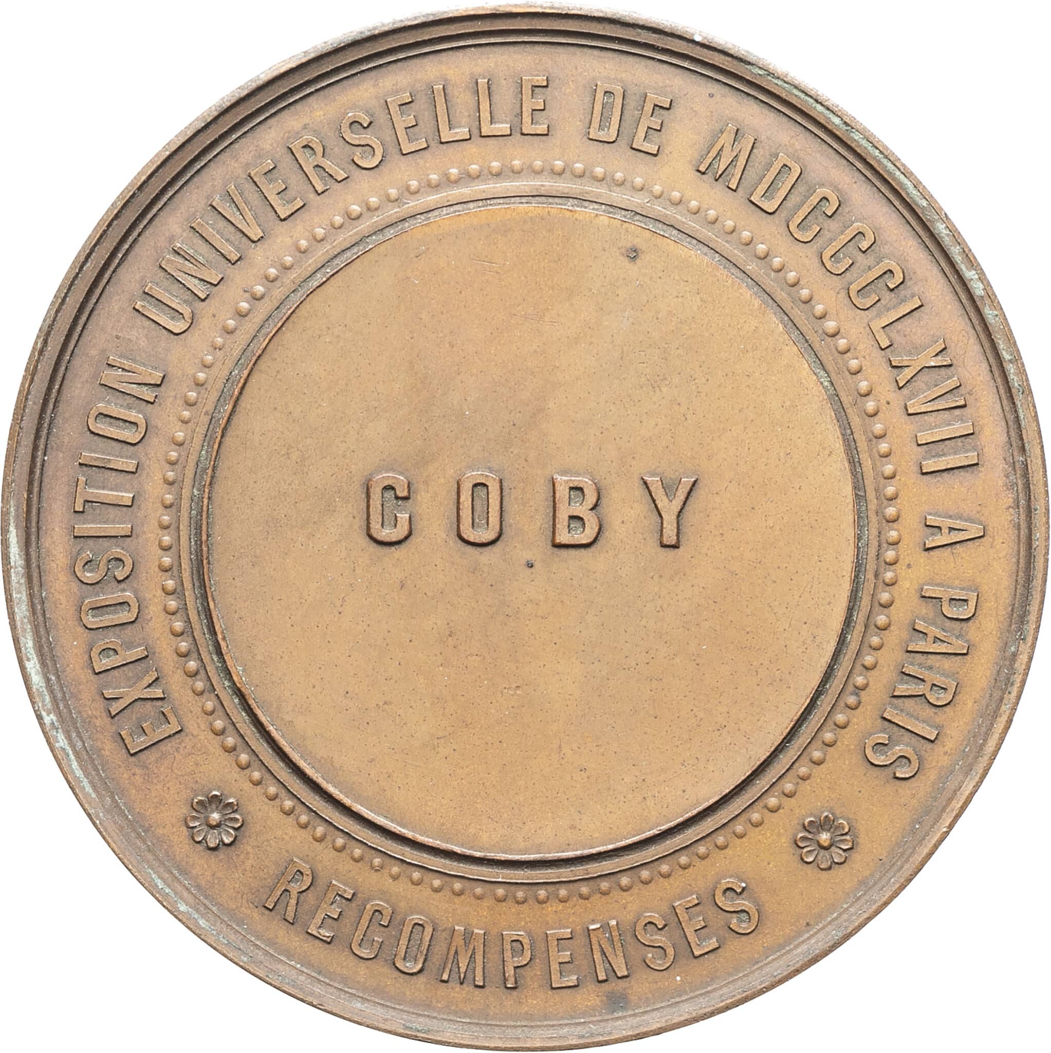 Rv. EXPOSITION UNIVERSELLE DE MDCCCLXVII A PARIS / * RECOMPENSES *. Au centre, attribution.