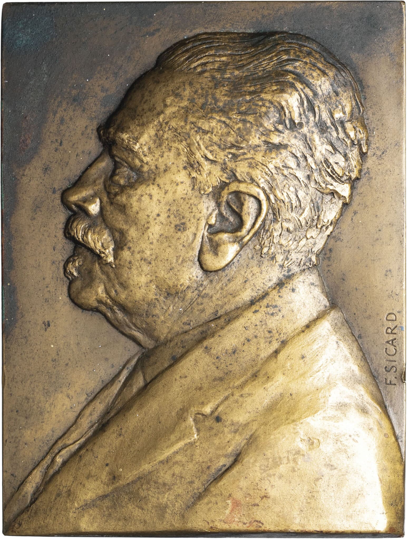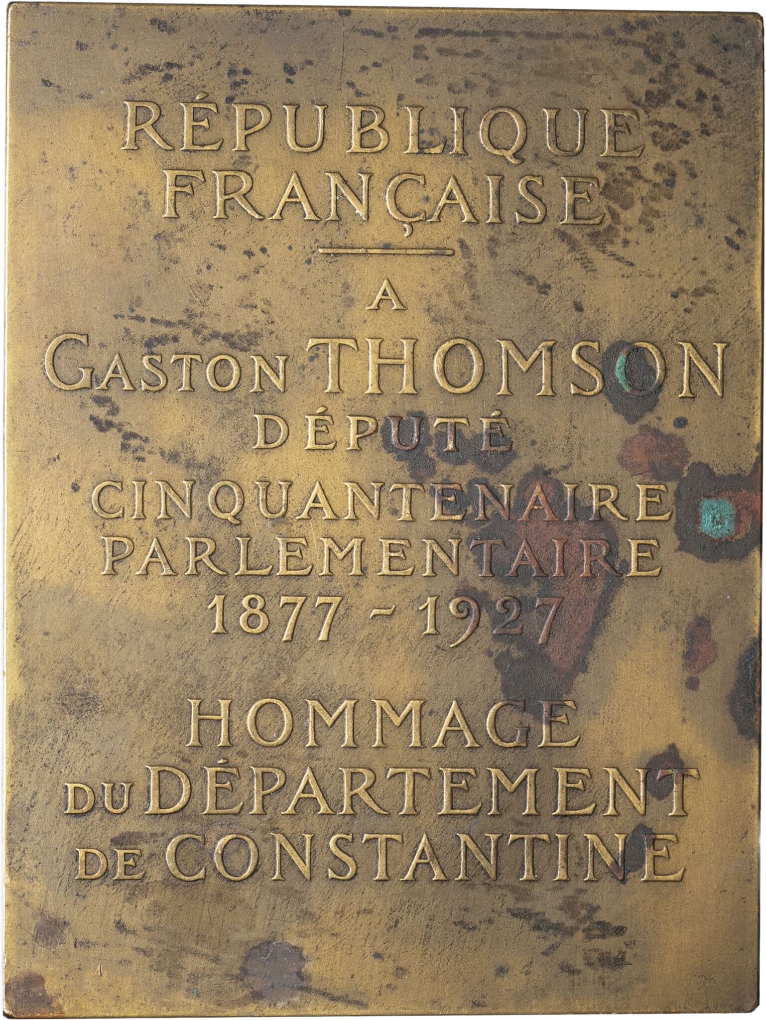 - ALGERIA IIIe République (1870-1940). Plaque, cinquantenaire parlementaire de Gaston Thomson, hommage du département de Constantine, par F. Sicard 1927, Paris.
