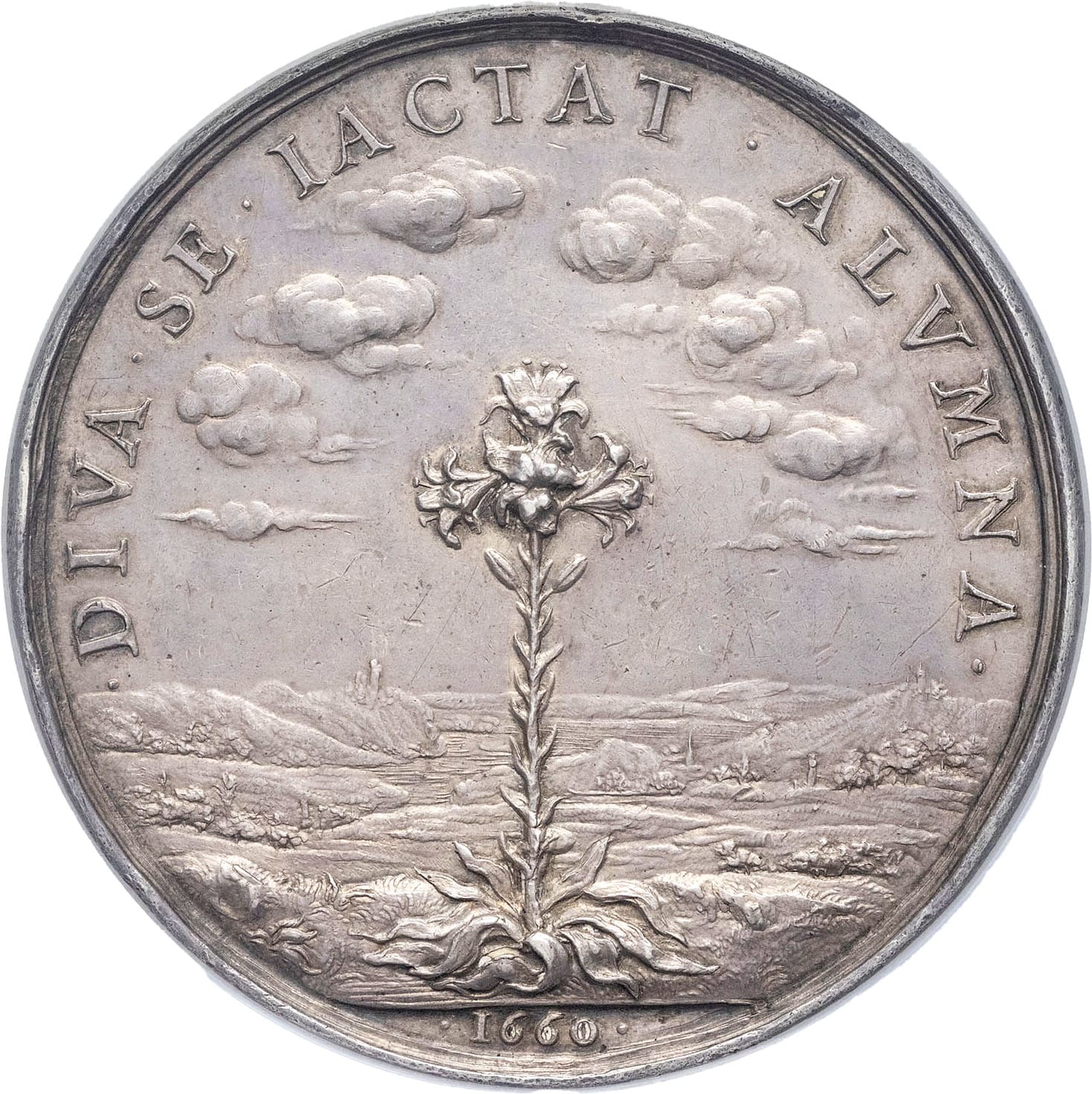Rv. DIVA. SE. LACTAT. ALVMNA. Dans un paysage, une grande fleur de lis ; à l’exergue : (date).
