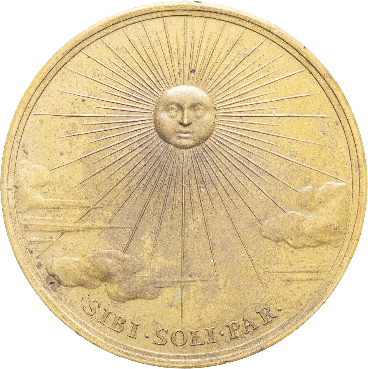 Frappe postérieure. Légende qui signifie “Il n'a d'égal que lui-même”. Patine marron-ocre. Superbe à Fleur de coin.
