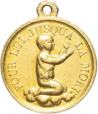 Rv. POUR LUI JUSQUA LA MORT. Sur des nuages, le duc de Bordeaux agenouillé à droite, nu, avec l’ordre du Saint-Esprit et levant les bras.