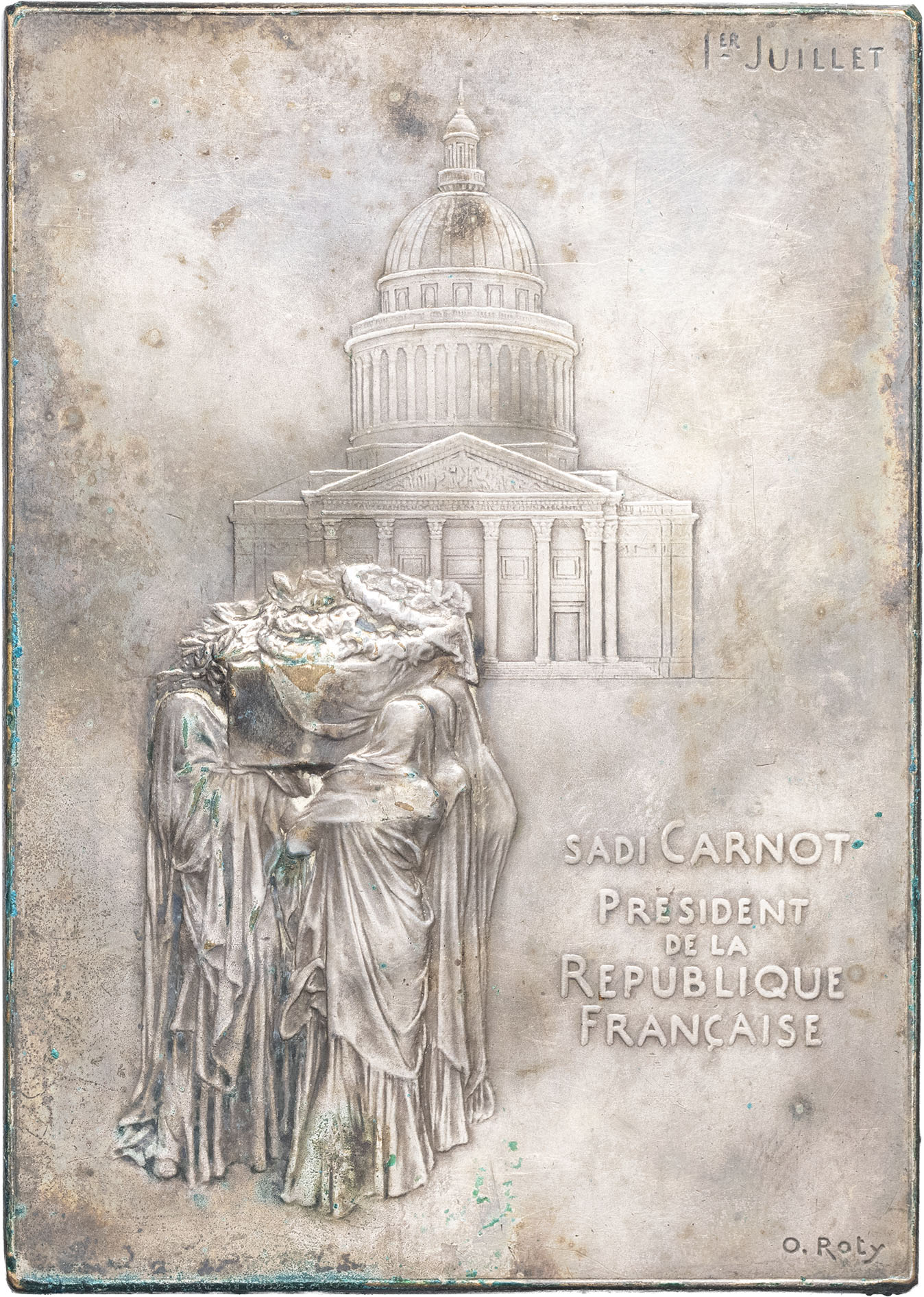 Rv. SADI CARNOT/ PRESIDENT/ DE LA/ REPUBLIQUE/ FRANÇAISE. Figures voilées portant le cercueil de Sadi Carnot au Panthéon ; Ier JUILLET et signature O. ROTY.