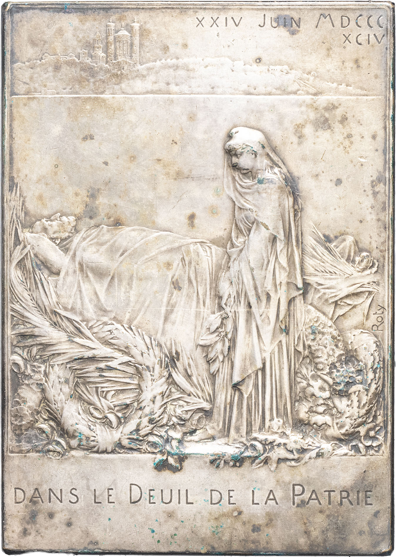 Av. DANS LE DEUIL DE LA PATRIE. La France en train de pleurer le défunt Carnot sur son lit, en arrière-plan la basilique Notre-Dame de Fourvière de Lyon ; XXIV JUIN MDCCCXCIV et signature ROTY.