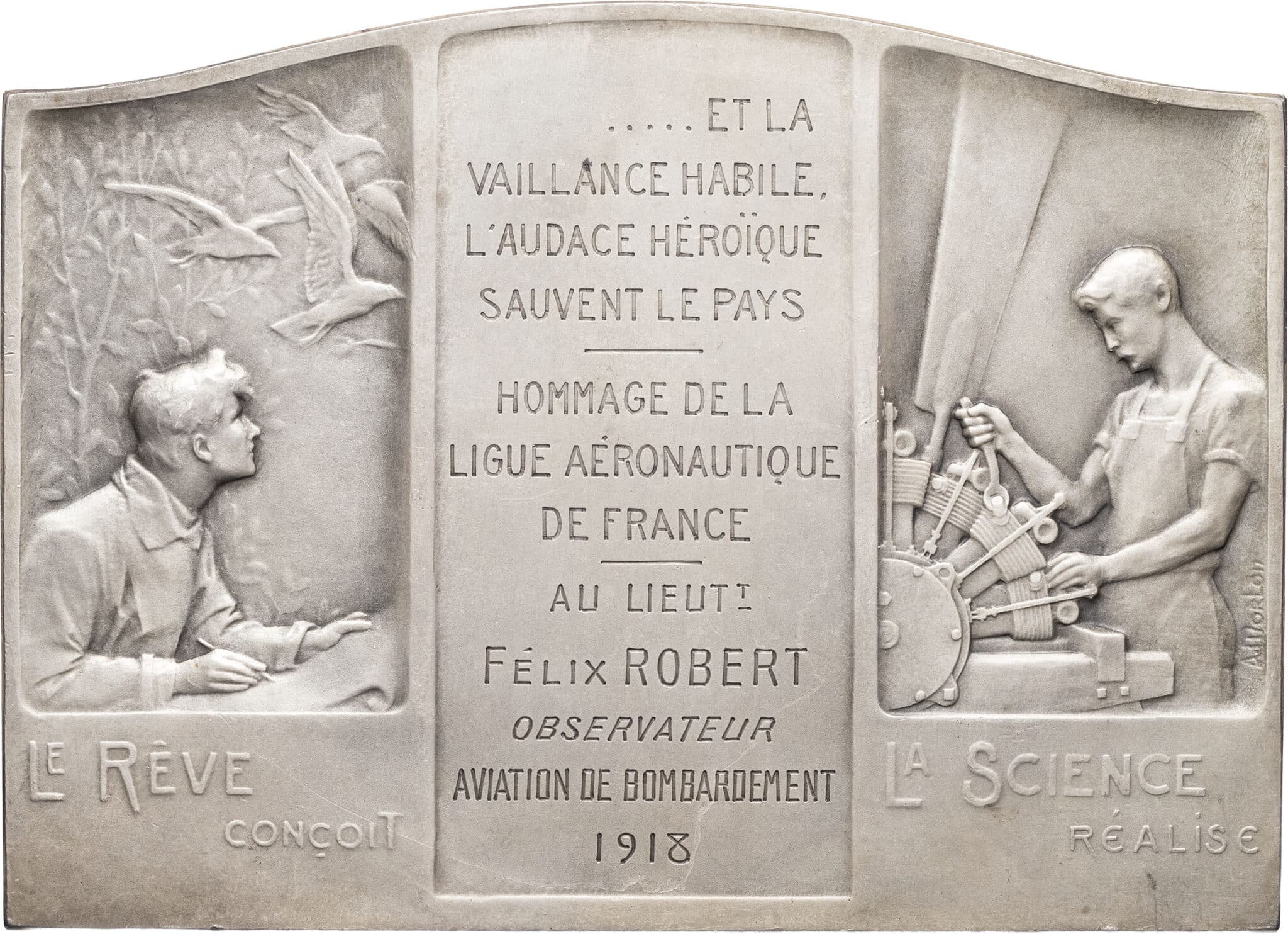 Gravure au centre du revers : ..... ET LA VAILLANCE HABILE, L’AUDACE HÉROÏQUE SAUVENT LE PAYS / HOMMAGE DE LA LIGUE AÉRONAUTIQUE DE FRANCE / AU LIEUTT FÉLIX ROBERT OBSERVATEUR AVIATION DE BOMBARDEMENT 1918”.