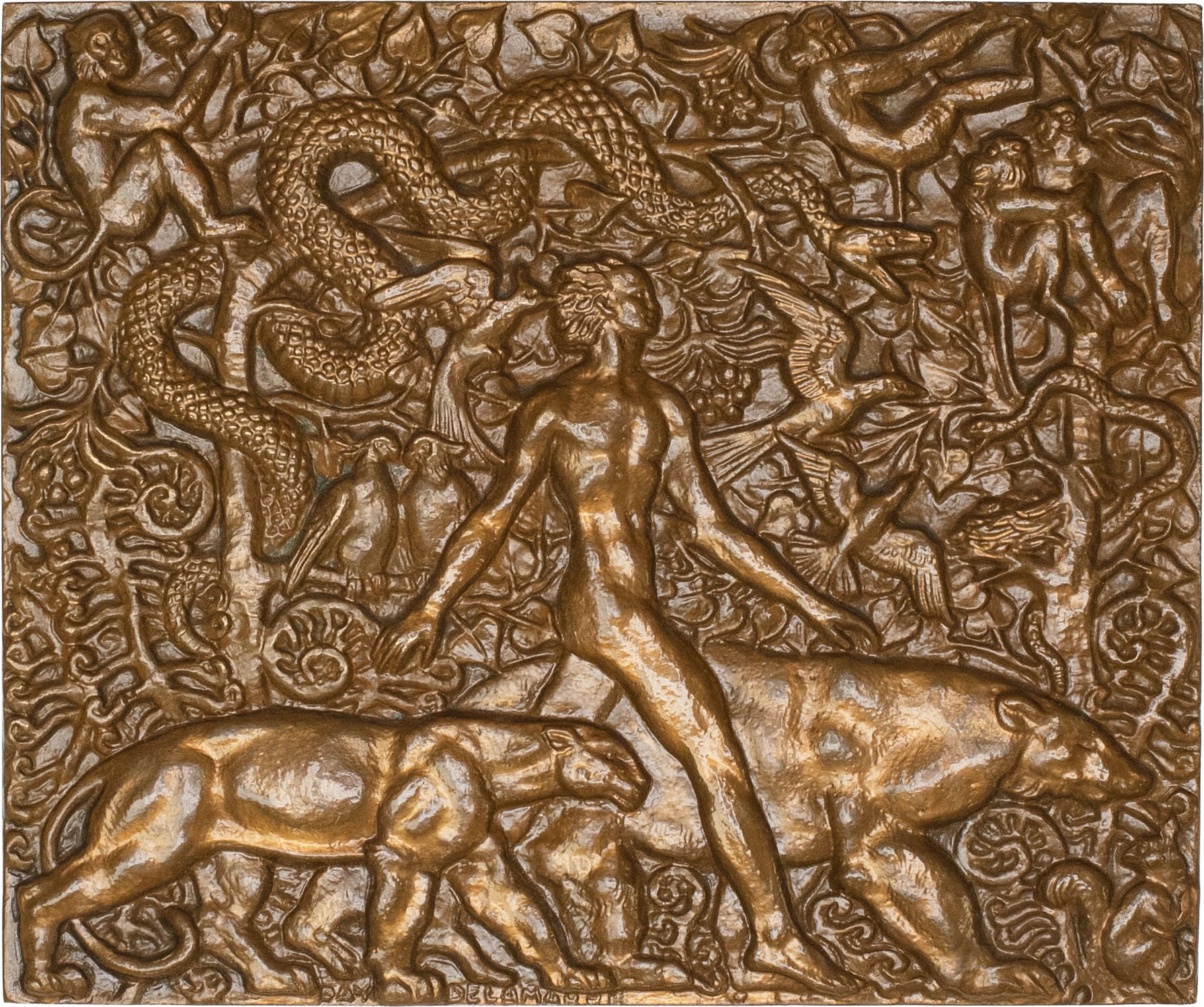 Raymond Delamarre (1890-1986) lisait dans son enfance les romans de Rudyard Kipling, en particulier «Le Livre de la Jungle» de 1894, avec Mowgli, Baloo et Baghera. En 1927, il réalisa pour Jacques Dembiermont un bas-relief en plâtre patiné de 188 x 212 cm, après de nombreux dessins préparatoires, en particulier des animaux vivants du Jardin des Plantes de Paris. En 1969, Raymond Delamarre cède le modèle et les droits de reproduction de cette œuvre à la Monnaie de Paris qui émet une plaque disponible dans sa boutique [Site internet : https://atelier-raymond-delamarre.fr/]