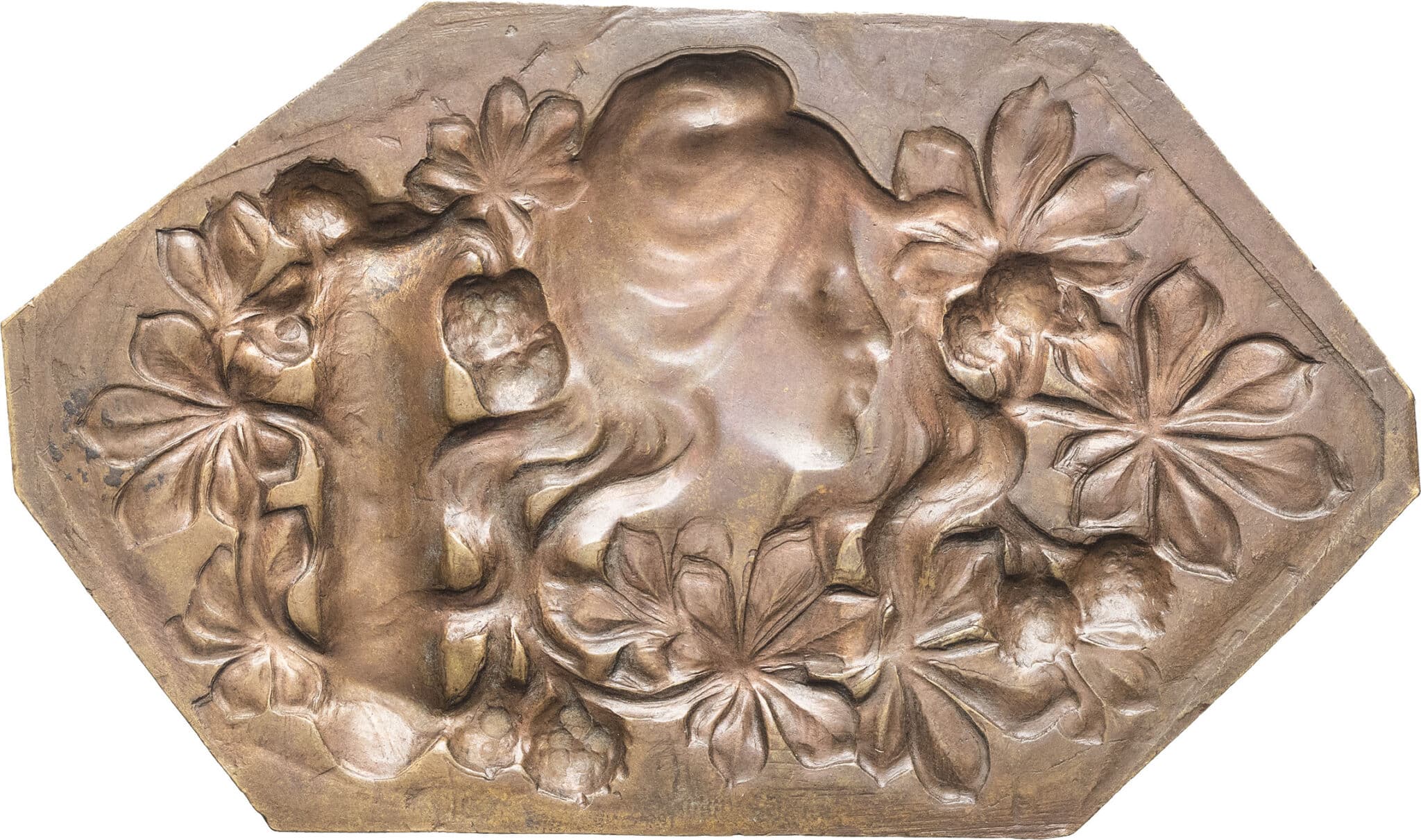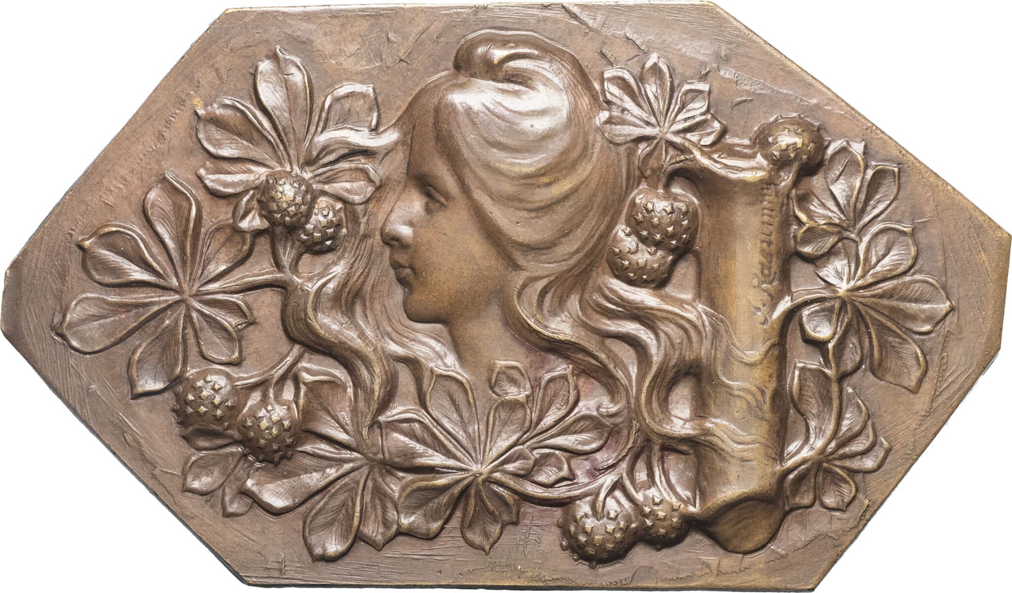 Plaque de forme hexagonale (pans coupés à 3 et 9 h.) représentant un buste de jeune femme au centre de branches de marronnier ; signature sur la branche principale F. Rasumny : Épreuve d'artiste uniface en cuivre. Très rare. Superbe à Fleur de coin.