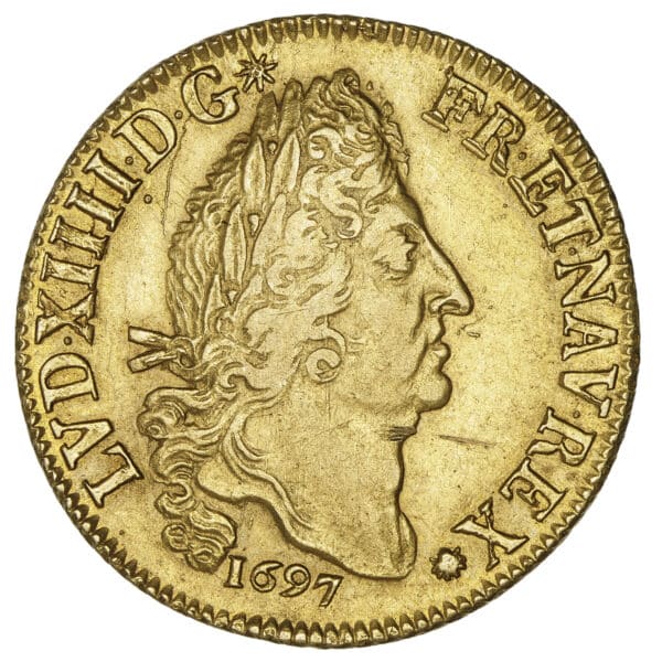 Louis XIV (1643-1715). Double louis d’or aux quatre L, flan neuf 1697, A, Paris.
