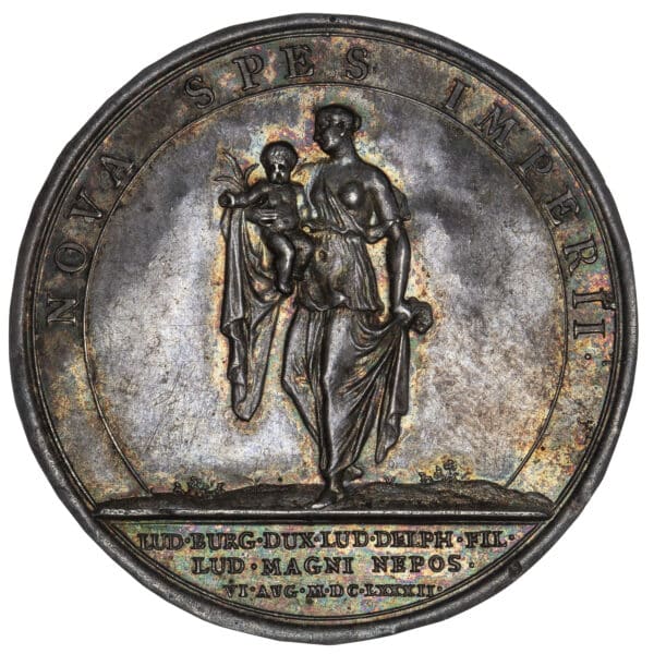 Louis XIV (1643-1715). Cliché estampé du revers de la médaille, Naissance du duc de Bourgogne par Mauger 1682, Paris.