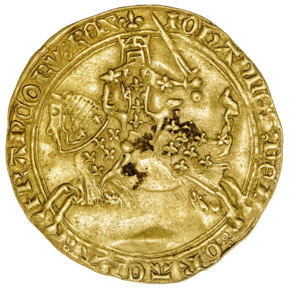 Av. IOHANNES: DEI: GRACIA: FRANCORV: REX. Le roi à cheval, galopant à gauche, l’épée haute, coiffé d’un heaume couronné sommé d’un lis, portant par-dessus sa cotte de mailles une cotte d’armes fleurdelisée ; le caparaçon du cheval est fleurdelisé.