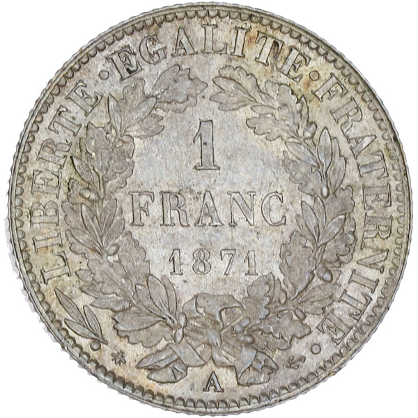 Gouvernement de Défense Nationale (1870-1871). 1 franc Cérès 1871, A, Paris.