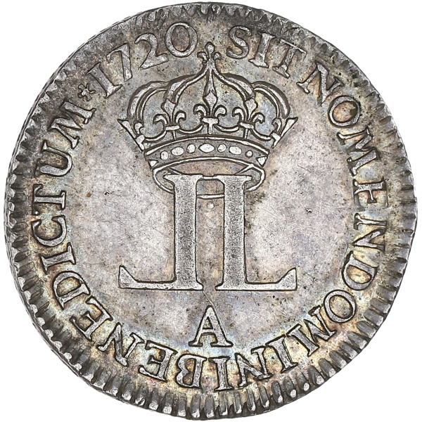 Rv. SIT. NOMEN. DOMINI. BENEDICTUM. (date). Deux L adossées, sous une couronne ; (atelier) au-dessous.