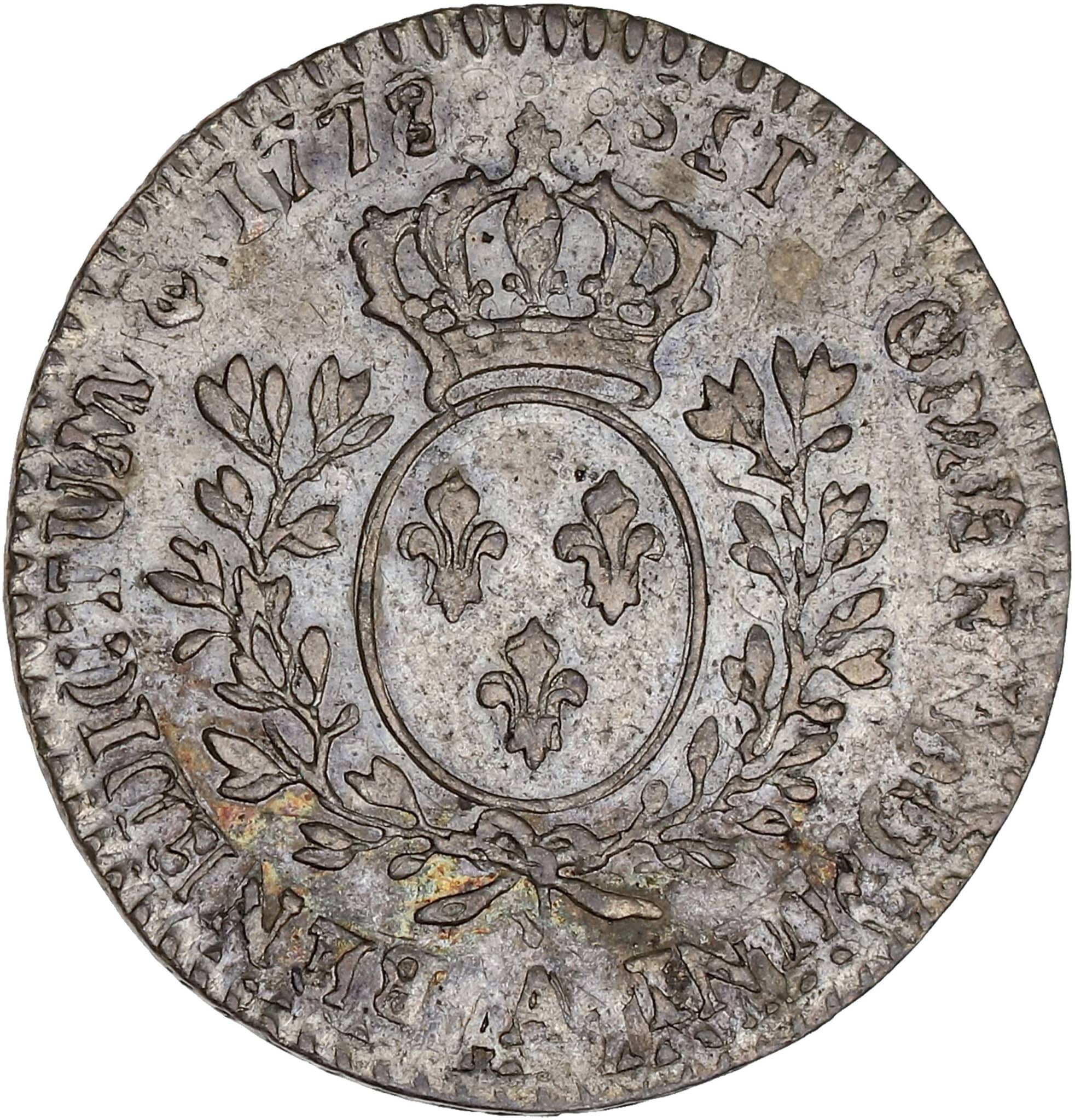 Rv. SIT. NOMEN. DOMINI. BENEDICTUM. (date). Écu de France ovale, couronné, entre deux rameaux d’olivier, (atelier) au-dessous.