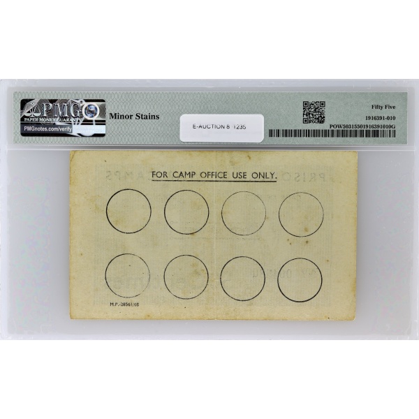 Numéro 004580, c’est un billet de banque utilisé dans un camp de prisonniers en France (impression Grande-Bretagne) et valeur en francs très rare et jamais vu lors d’une vente aux enchères.
