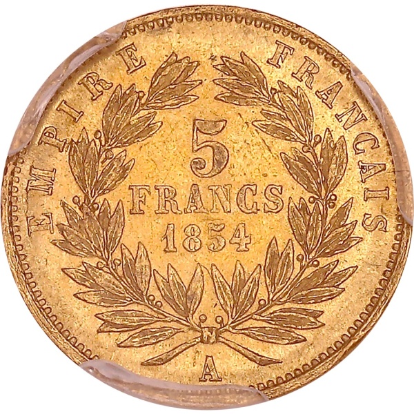 Second Empire / Napoléon III (1852-1870). 5 francs tête nue petit module, tranche lisse 1854, A, Paris.