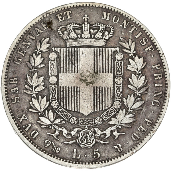 Savoie-Sardaigne, Victor-Emmanuel II (1849-1861). 5 lire 1851, ancre, Gênes.
