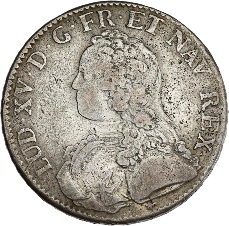 Av. LUD. XV. D. G. FR. ET. NAV. REX. Buste du Roi à gauche, la tête nue, portant une veste brodée avec la croix de l’ordre du Saint-Esprit ; au-dessous (différent).