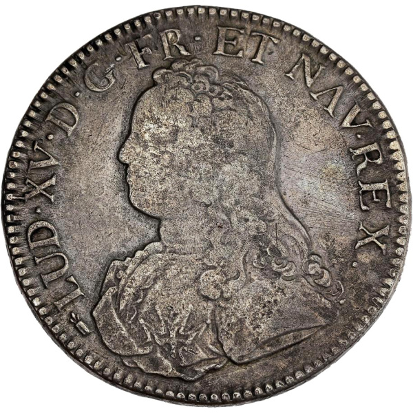 Av. LUD. XV. D. G. FR. ET. NAV. REX. Buste du Roi à gauche, la tête nue, portant une veste brodée avec la croix de l’ordre du Saint-Esprit ; au-dessous (différent).
