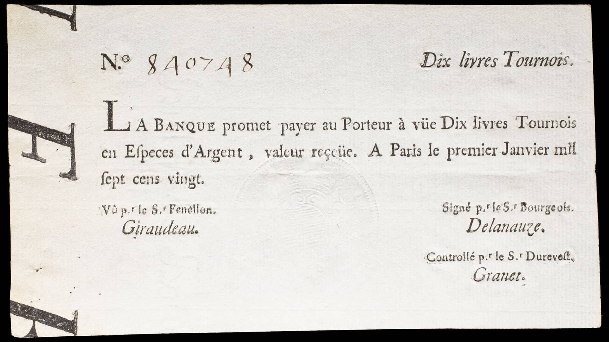 - 10 livres tournois typographié - Banque de Law 1er janvier 1720.