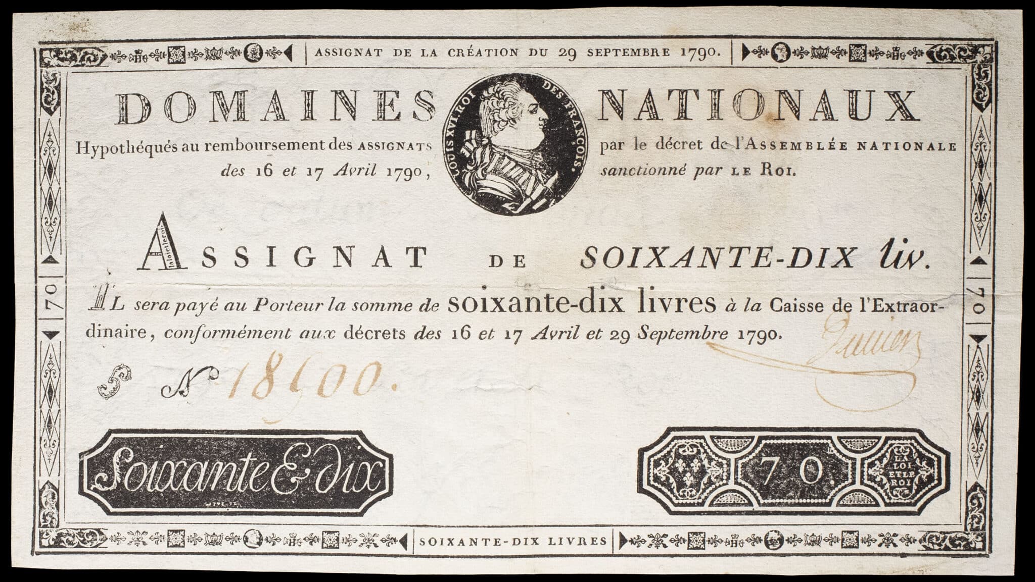 - Assignat de 70 livres - Domaines nationaux 29 septembre 1790.