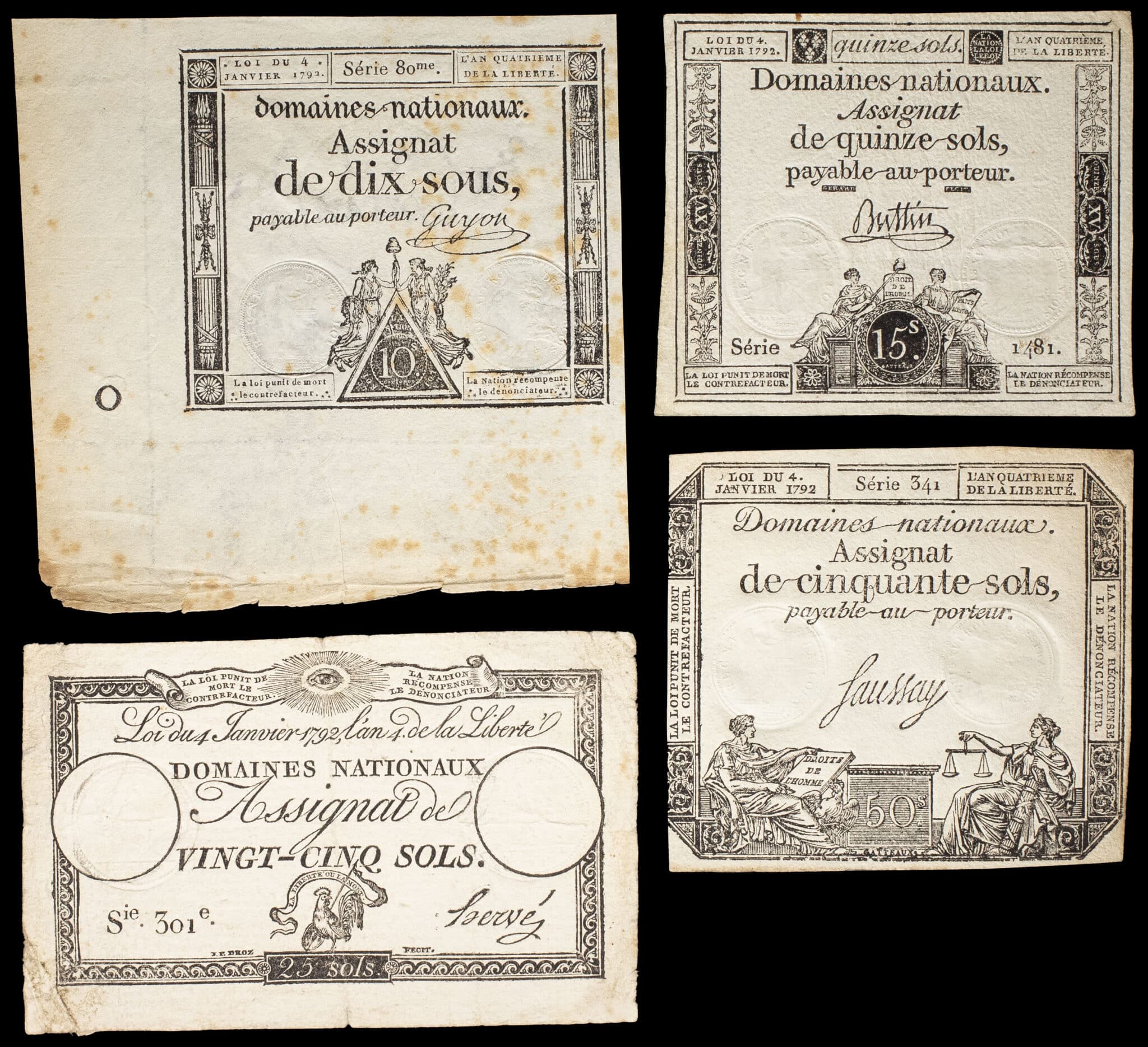 - Lot (4) - Assignat de 10, 15, 25 et 50 sols - Domaines nationaux 30 avril 1792.